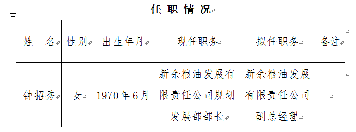 为加强新余粮油发展有限责任公司领导班子建设,根据民主推荐和考察情况,经市粮食局党委研究决定,现将钟招秀同志拟任职情况进行公示,欢迎广大干部、群众对她的德、能、勤、绩、廉和遵纪守法情况进行监督,对公示对象有反映问题的,可拨打局机关党委电话,联系电话:6440672,监督电子举报信箱:[email protected]