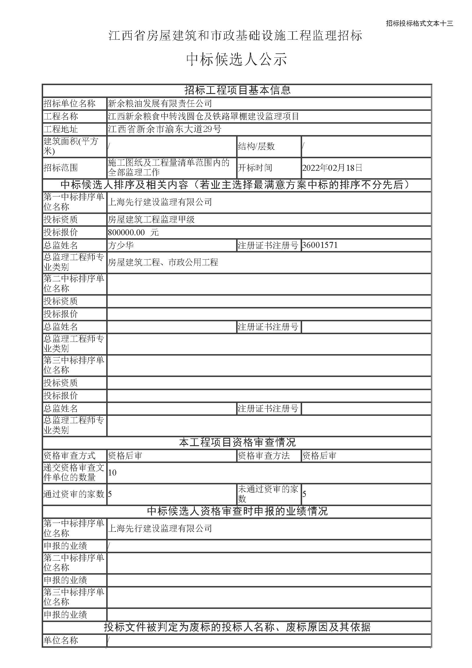 江西新余粮食中转浅圆仓及铁路罩棚建设监理项目中标候选人公示