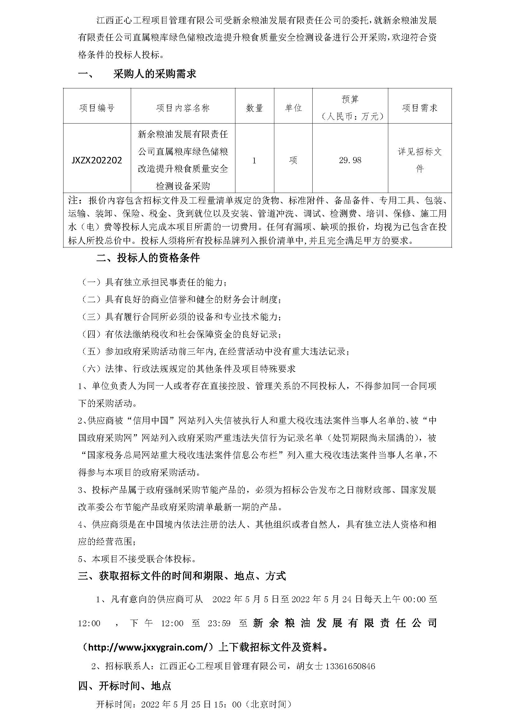 新粮公司直属粮库绿色储粮改造 提升粮食质量安全检测设备采购项目采购公告