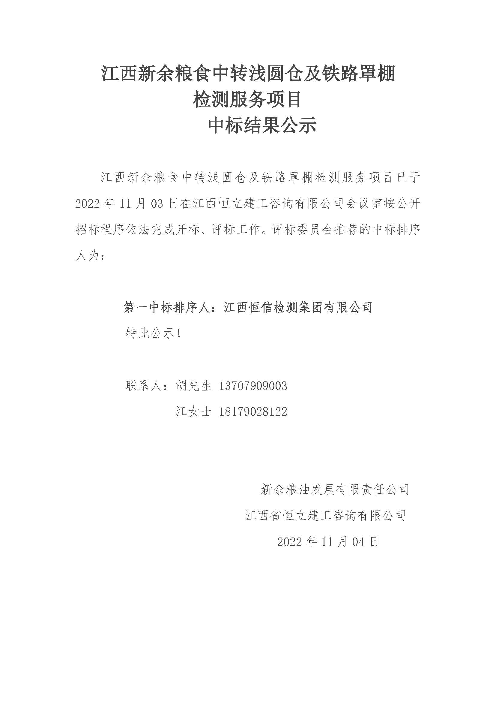 江西新余粮食中转浅圆仓及铁路罩棚中标结果公示